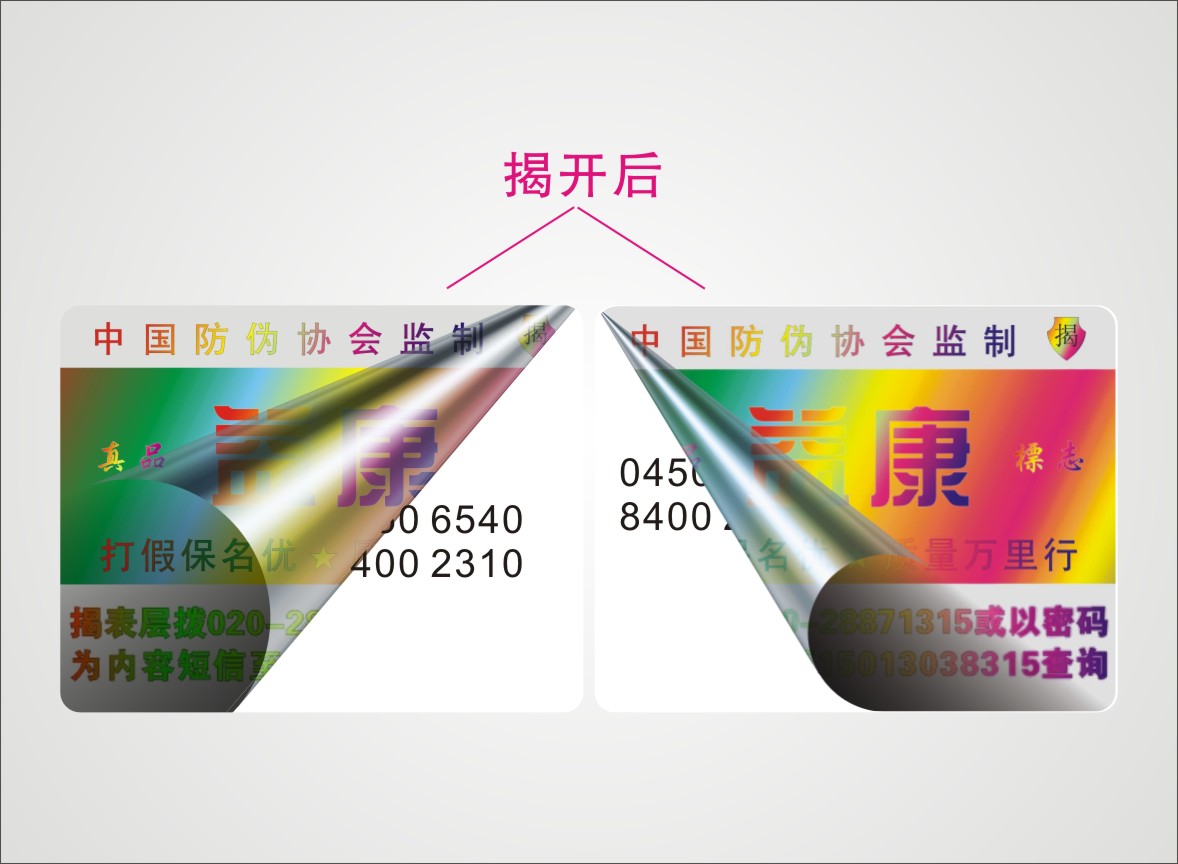編碼印在涂層的下面,在涂層沒被刮開之前是保密的。(所有標(biāo)簽編碼都被涂層覆蓋,貼到產(chǎn)品上都是完好無損的,產(chǎn)品賣到消費(fèi)者手中后才可以被刮開查詢,在這之前是絕對(duì)保密的)