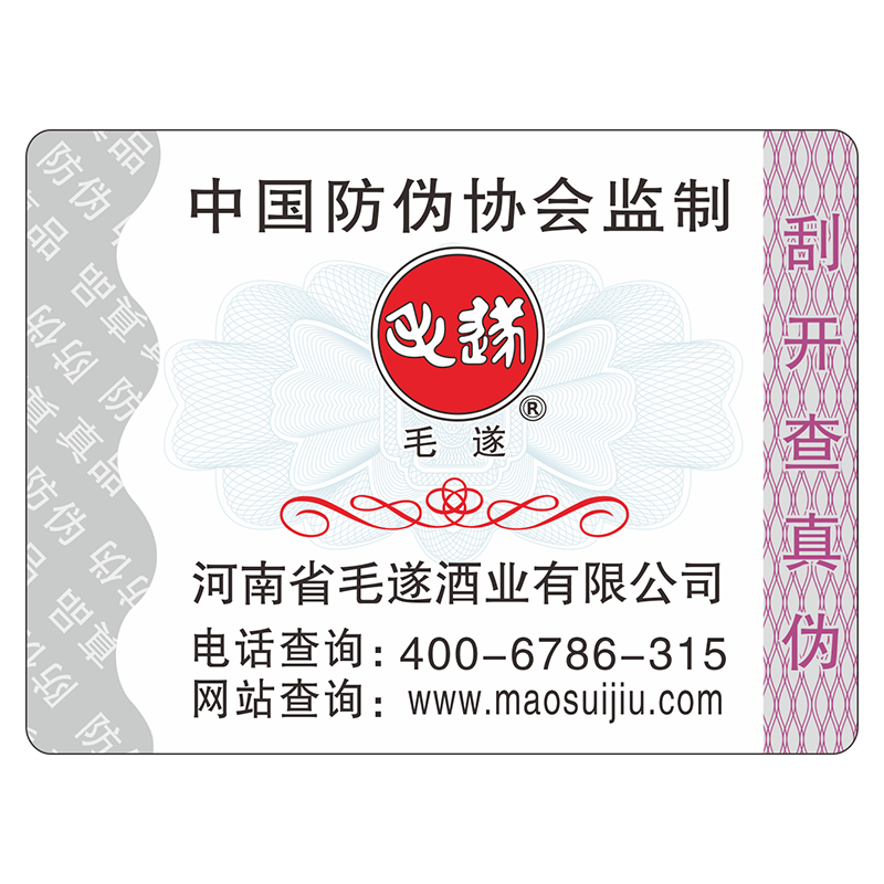 本標識采用單邊波浪形二維激光定位燙,具有激光動態和二維立體效果,在標識上燙“真品防偽”文字 在不同的角度下色彩絢麗且變化多樣,本產品還采用了目前主流的數碼防偽和印鈔團花防偽技術.安全等級高,仿冒難度大.